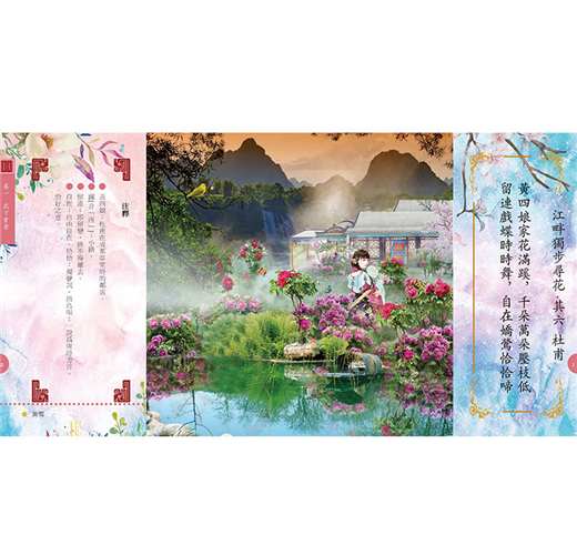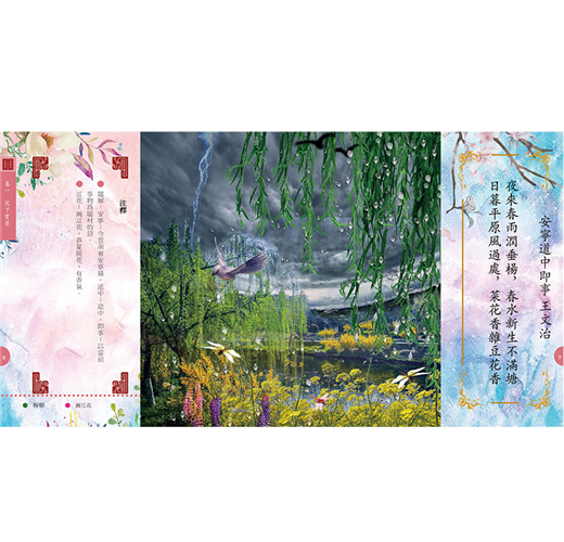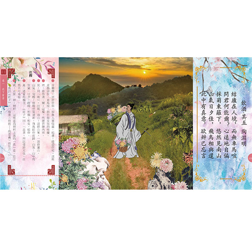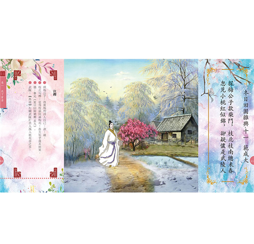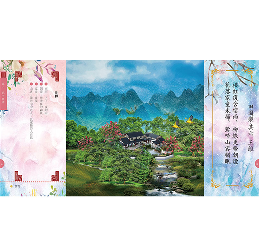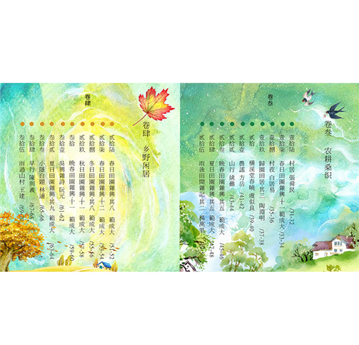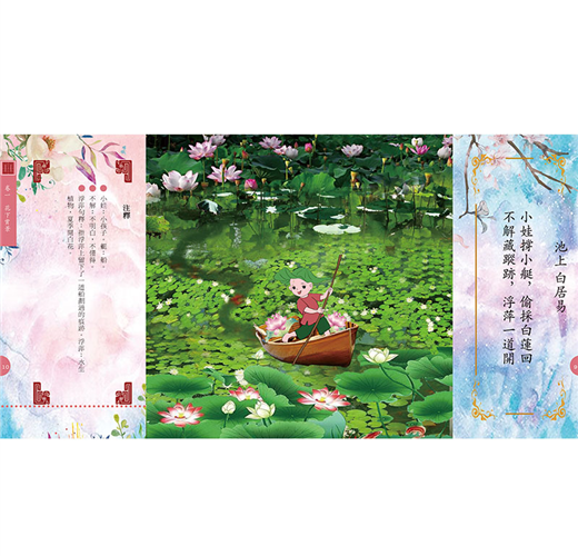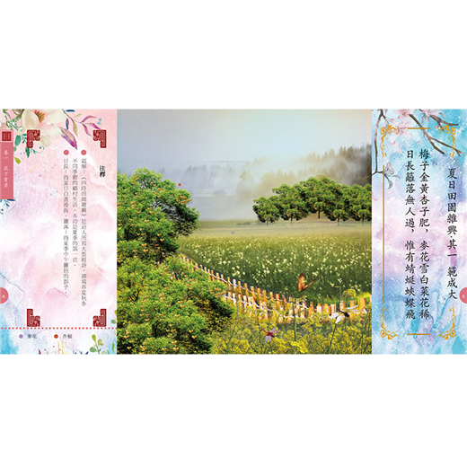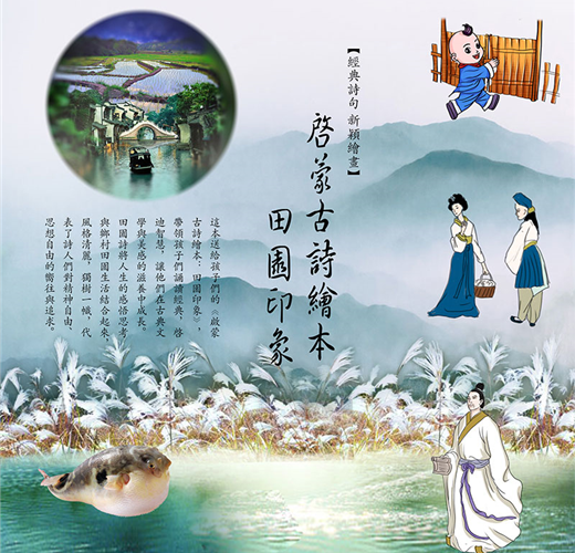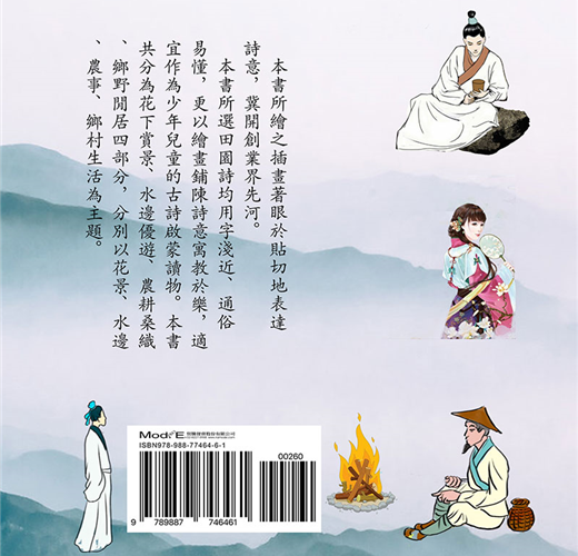 《啓蒙古詩繪本:田園印象》所繪之插畫著眼於貼切地表達詩意,冀開創業界先河。——選取田園詩均用字淺近、通俗易懂,更以繪畫鋪陳詩意,寓教於樂,適宜作為少年兒童的古詩啟蒙讀物。本書共分為花下賞景、水邊優遊、農耕桑織、鄉野閒居四部分,分別以花景、水邊、農事、鄉村生活為主題。