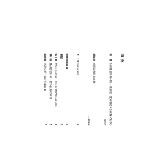 於是,這本書就是伊斯蘭教的故事。這個故事深深烙印在第一代穆斯林的記憶中,並由最早為先知穆罕默德作傳的伊本─伊斯哈格(Ibn Ishaq,七六八年歿)、伊本─希夏姆(Ibn Hisham,八三三年歿)、巴拉祖里(al-Baladhuri,八九二年歿)與塔巴里(al-Tabari,九二二年歿)記載下來。這個故事的核心是《榮耀古蘭經》(The Glorious Quran)─穆罕默德前後共約二十三年間在麥加和麥地那獲得的天啟。雖然《古蘭經》基於某些後來才明朗的原因,對穆罕默德的生平著墨不多(確切地說,書中鮮少提及穆罕默德),但它的彌足珍貴在於呈現出穆斯林信仰誕生初期的意識形態;「初期」指的是信仰尚未成為宗教、宗教尚未成為制度的時候。