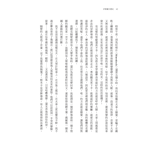 時值午夜,到馬拉喀什(Marrakech)還要五個小時。我向來很難在火車上睡覺。當輪子在鐵軌上轉動時,那毫無間斷的節奏與隆隆聲響總令我無法入眠。就像一段遠方的旋律,音量不大卻又無法忽視。就連在夜裡淹沒車廂的黑暗,似乎也無所助益。每到夜裡,廣袤無聲的沙漠從我車窗外疾速掠過,星星成為這片沙漠中唯一可見的光,這時的狀況最糟了。
