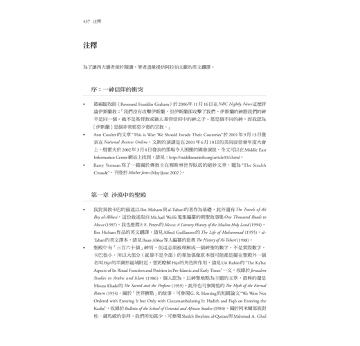 於是,這本書就是伊斯蘭教的故事。這個故事深深烙印在第一代穆斯林的記憶中,並由最早為先知穆罕默德作傳的伊本─伊斯哈格(Ibn Ishaq,七六八年歿)、伊本─希夏姆(Ibn Hisham,八三三年歿)、巴拉祖里(al-Baladhuri,八九二年歿)與塔巴里(al-Tabari,九二二年歿)記載下來。這個故事的核心是《榮耀古蘭經》(The Glorious Quran)──穆罕默德前後共約二十三年間在麥加和麥地那獲得的天啟。雖然《古蘭經》基於某些後來才明朗的原因,對穆罕默德的生平著墨不多(確切地說,書中鮮少提及穆罕默德),但它的彌足珍貴在於呈現出穆斯林信仰誕生初期的意識形態;「初期」指的是信仰尚未成為宗教、宗教尚未成為制度的時候。