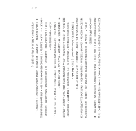 美國人一把抓住我的肩膀,把我轉向他。「能不能請你告訴這個人我們在睡覺?」他很年輕,非常高大,有一對大大的綠眼睛,一頭濃密的金髮垂下來蓋在他臉上,他不斷用手指將髮絲撥回去。「我們只是在睡覺,」他重複道,嘴形很誇張,彷彿我在讀他的唇語似的。「您明白嗎?」
