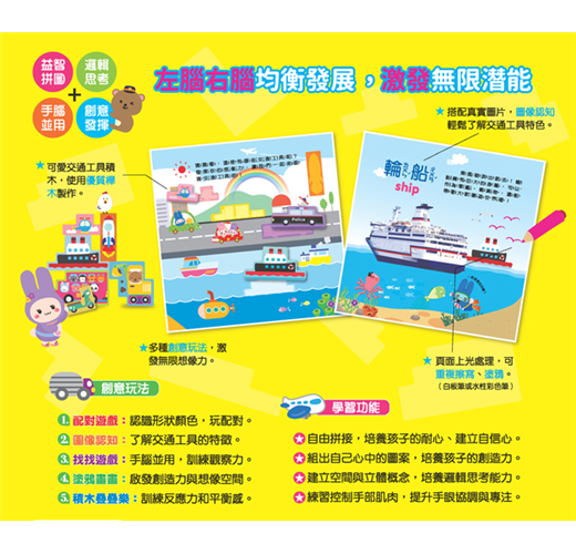 透過可愛的交通工具立體拼板,可以認識交通工具、顏色,建立空間概念,是款兼具遊戲與學習功能的益智教具。在拼圖過程中,還能提升手眼協調力、培養專注力與訓練思考能力。