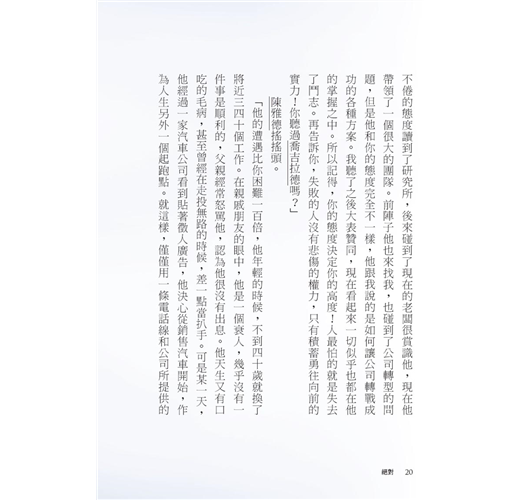 陳雅德聽我很懇切地對他說這一番話以後,他的眉頭鎖得更緊。「你也認識張某某,他是一位從小就殘廢的人,可是他靠著好學不倦的態度讀到了研究所,後來碰到了現在的老闆很賞識他,現在他帶領了一個很大的團隊。前陣子他也來找我,也碰到了公司轉型的問題,但是他和你的態度完全不一樣,他跟我說的是如何讓公司轉戰成功的各種方案。我聽了之後大表贊同,現在看起來一切似乎也都在他 的掌握之中。所以記得,你的態度決定你的高度!人最怕的就是失去了鬥志。再告訴你,失敗的人沒有悲傷的權力,只有積蓄勇往向前的實力!你聽過喬吉拉德嗎?」