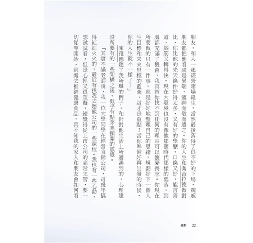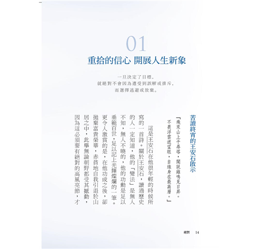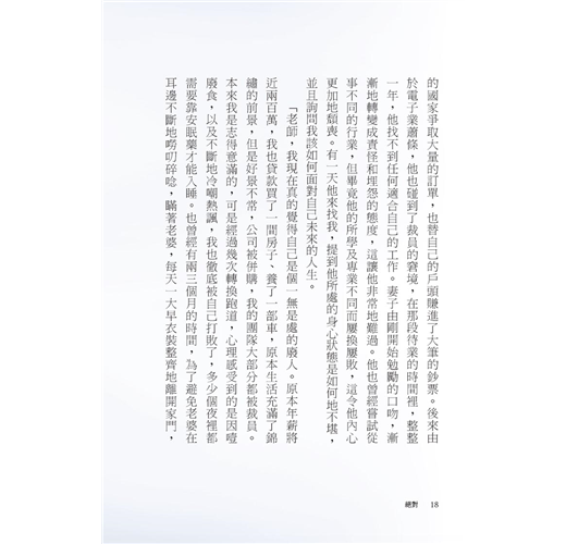 《絕對》一書正是從這些歷史人物、成功人士做一鋪墊,「鑑古知今」地去看現實人生的種種遭遇。王薀老師授課數十年間,有著無數的學員、朋友,他們切身實際的案例,也正是你我經常遇到的問題。老師以其智慧為學生解開人生困惑,循循善誘,將其導向正面的能量。對於迷失於人生十字路口而臨歧徬徨的人,真彷如黑暗中的一盞明燈,指引其走向康莊大道。書中學生的問難以及老師指點迷津的智慧語錄,令人不禁想起孔門師生間的對話集《論語》一書,在問答之間,閃現智慧的火花,帶給讀者無限的啟示。