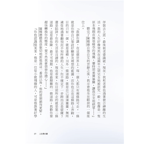 「我跟你講,在這個世界上,每一個人都只有兩條路可走。一條就是你替自己架設好願景及理想的藍圖,而你也正在這條路上奔跑,目的只有一個,就是達標。另外一條道路,就是自己渾渾噩噩,無所適從地過著顢頇而不知所措的人生,你不確定下一步跨出去是窟窿?還是陷阱?你的生活是沒譜的。現在看來,你目前所走的就是第二條道路,這是最危險、最不可預期,也是最顛簸的一條道路。我勸你要趕快轉換你的態度,要不然我會很替你擔心……」