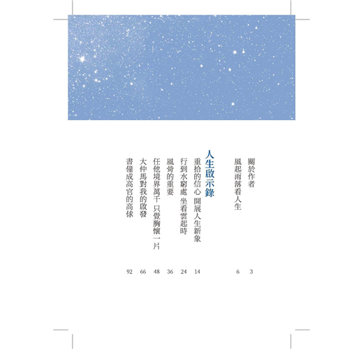 在本書中,作者娓娓道來中外名人的迭宕生平,並對應作者眾多學生的人生故事,兩相映照,彰顯出在面對人生的困難及挑戰時,所應具備的態度及特質,如能掌握住信心、無懼、風骨、平常心、堅強、樂觀、勇氣各種等等正面積極的力量,即使在人生不可免的高低起伏中,依然能掌握自己的方向,不被各種不可預期的困境所擊敗,從而開創出自己的一片胸懷萬千的天地,自在的看待花開花落、雲卷雲舒。