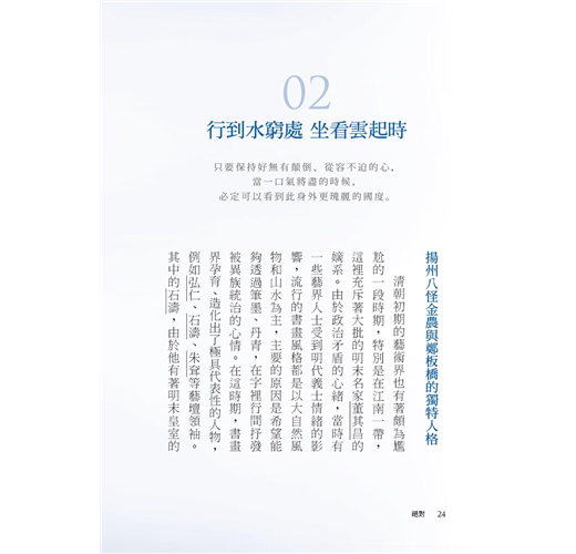 由於大量廣泛地閱讀中外名著,再由此探求作者寫作的初心及其一生的遭遇,自然感受與體會不同,而可達到「知人論世」之境。除此而外,王薀老師還遍讀中外古今名人的傳記,於是從王安石、鄭板橋、王維、王勃、晏殊、葛洪、卓別林……等等中外名人的故事中去探究其成功背後的因素,尤其特別看重其窮困潦倒或從高峰跌落時,他們如何地自處,這個獨特的視角,構成了《絕對》一書的主要基調。