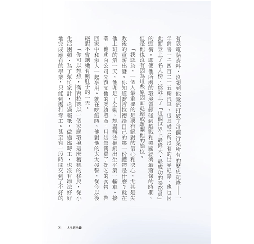 陳雅德搖搖頭。 「他的遭遇比你困難一百倍,他年輕的時候,不到四十歲就換了將近三四十個工作。在親戚朋友的眼中,他是一個衰人,幾乎沒有一件事是順利的,父親經常怒罵他,認為他很沒有出息。他天生又有口吃的毛病,甚至曾經在走投無路的時候,差一點當扒手。可是某一天,他經過一家汽車公司看到貼著徵人廣告,他決心從銷售汽車開始,作為人生另外一個起跑點。就這樣,僅僅用一條電話線和公司所提供的有限電話資料,沒想到他竟然打破了這個行業所有的歷史紀錄——一年銷售一千四百二十五輛汽車。這是過去所沒有的世界紀錄,他也因此而登上了名人榜,被冠上了「這個世界上最偉大、最成功的業務員」的頭銜。即便他所處的環境曾經碰到越戰和美國經濟最蕭條的時期,但是他也沒有因為這些原因而退縮或離開他的崗位。