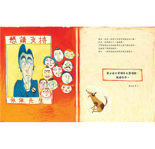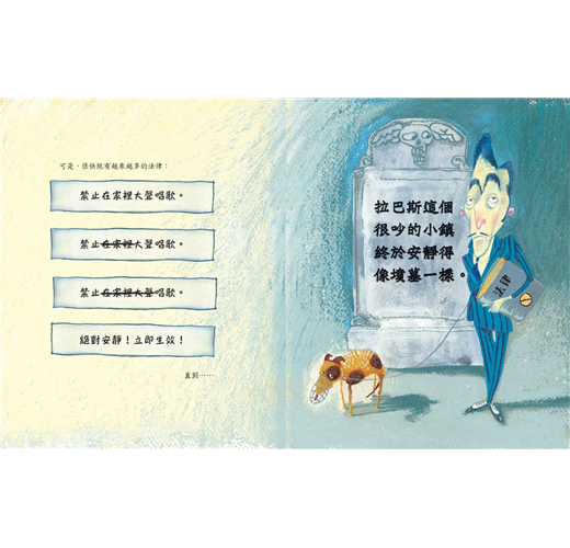於是鎮民選了什麼都管的佩佩先生做他們的鎮長。沒多久,任何有聲音的活動都被法律禁止了。