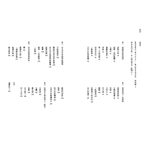 推薦序 像她這樣的一個女(夫)子──讀《時光走向女孩》◎李欣倫 推薦序 時光走向女孩,女人雕刻時光◎許悔之 輯一 我想對妳說說話 迷路以後 寂靜,然而飽滿 小潮汐 喜歡的是妳 背叛 愛,不因為誰 成為你自己 一點點甜 王先生的音樂課 輯二 當我成為一名教師 我要當老師 父親的情書 吾師 分別心 作文海 馴服 一路順風 安靜微小的存在 自己的樣子 輯三 在太空中會感到孤獨嗎 不能說黑色 關起門來的美好寂寞 在太空中會感到孤獨嗎 寂寞四種 貳夢 經常,火車駛來 一眨眼 輯四 星空和微風裡的事 瘤 那樣的企盼 一塊錢的記憶 她還年經 盤古開學 船後的波紋 異想 秋天的詮釋學 生活中的輕薄短小 輯五 每個女子都是地上一顆星 水族街 女體 桐花順 染髮 女王陛下 好人太多 後記/捕夢的人
