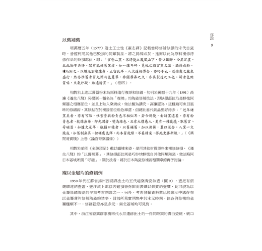 本書嘗試從文化史的觀點省思歷史上陶瓷修補術諸面向。既觀察了清代宮廷陶瓷修補改裝情況,以及乾隆皇帝對於缺損陶瓷的對應態度和補修理念,也討論了十七、十八世紀歐洲人針對中國陶瓷的金工鑲飾和改裝。在廣泛蒐集亞洲和歐洲鋦釘補修術案例的基礎之上,評估了區域間影響交流的可能途徑。另外,還著重討論日本史上所謂呼繼、燒繼和金繕技藝的源流及其對殘缺美的賞鑑風情。