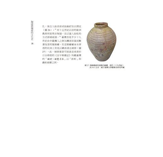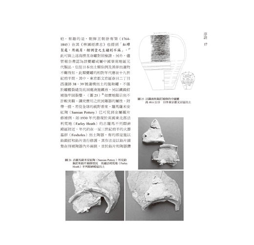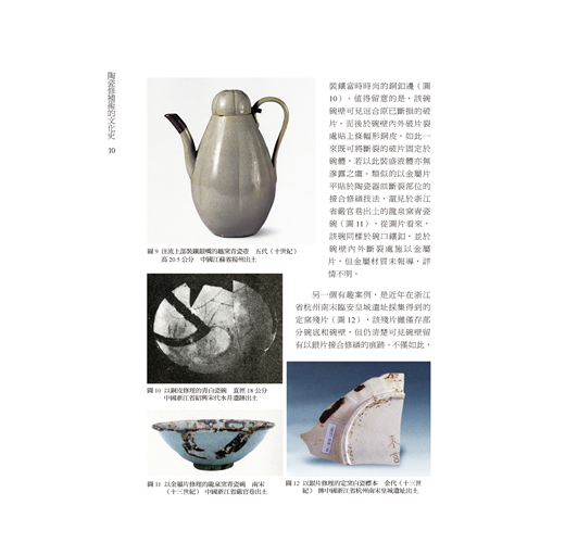 上釉的高溫陶瓷雖具有耐鹼抗酸、不虞腐爛的性能,卻極怕碰撞。歷史上因重力碰撞導致陶瓷缺磕破碎的例子極多,這些案例之所以會被記錄下來的原因不一,有的是心惜珍奇物件,有的是做為小說情節的鋪陳插曲,但也有用來襯托主人公價值觀的譬喻功能,是管窺其時生活史的有意義的素材。雖然有關陶瓷修補議題存在著諸多可資討論的面向,不過本書的目的是擬經由梳理歷史上幾個特定區域補修技藝的具體內涵,進而省思其於文化史上的位置。因此,本書既非具實用功能的陶瓷修護手冊,也不是探索歷史上陶瓷接著劑配方或復原修繕工序細節的科技史著作,而拜近代科學之賜所創發種類龐雜的高效能或環保黏著劑,以及各式修繕技術均不在本書討論之列。