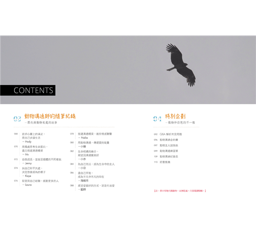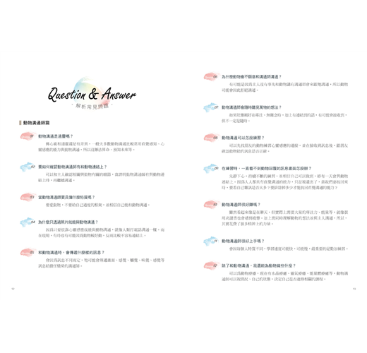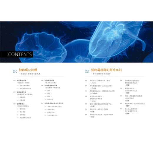 書中從動物的肢體語言、心靈感應等不同方面解析動物心,並運用練習題讓入門新手可以初步體驗,帶領大家喚醒傳心的能力,當練習後,能與動物連結,就有可能接收到動物傳遞的感覺、畫面等,依照溝通師覺醒的能力而定,這時,只要相信、連結,就能在溝通後拉近你與動物的距離!