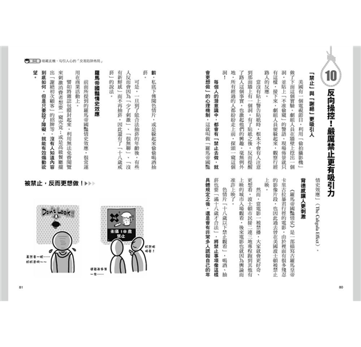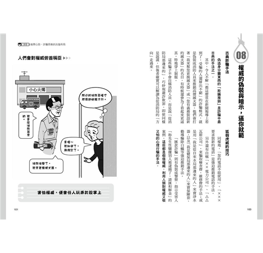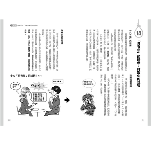 作者樺旦純以心理學專業,列舉了4大類共61種人們最常遭遇與最易掉落的騙局,其中包括了「感情欺瞞騙術」、「人際威逼洗腦」、「暗示誤導操控」、「交易陷阱佈局」,而每一種詐騙手法,樺旦純都以心理學作為基礎,言簡意賅地說明,幫助你快速掌握其中奧妙,學會迴避甚至反制。
