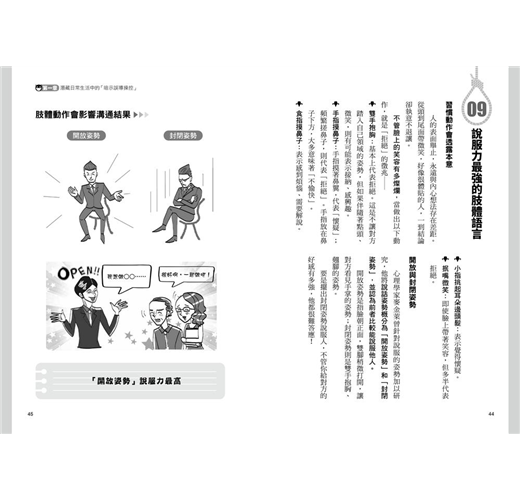 心理學家麥金萊曾針對說服的姿勢加以研究,他將說話姿勢概分為「開放姿勢」和「封閉姿勢」,並認為前者比較能說服他人。開放姿勢是指臉朝正面,雙腳稍微打開,讓對方看見手掌的姿勢;封閉姿勢則是雙手抱胸、翹腳的姿勢。