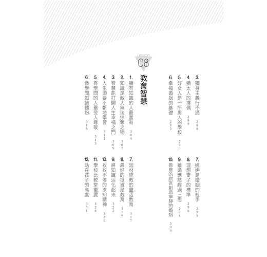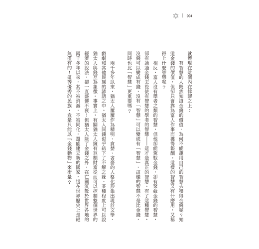 本書以猶太人在世界各地流散逃難的長遠過程中,融合並吸收了其他民族的智慧精髓,用來開創自己的生存空間。以融合和實踐各民族優秀之智慧為基礎,猶太人在生存、處世、生活、財富、經商、談判、婚姻、教育、信仰、幽默等方面創造並發展成屬於自己獨特又非凡的猶太智慧。這就是猶太民族發展過程中最為偉大、最為神奇的力量。