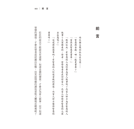 「既然如此,有智慧的人為何要為富人做事呢?而富人卻不為有智慧的人做事?大家都看到,學者、哲學家老是在討好富人,而富人卻對有智慧的人露出狂態呢?」