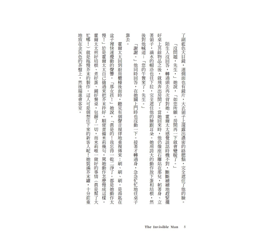 「我會馬上把它們烘得乾爽舒適,先生。」她說,端著他的衣服離開房間。她踏出門時又回頭看了一眼那人罩著白布的頭,以及那副藍色目鏡,餐巾仍然遮著他的臉。她關上門時微微發抖,臉上完全反映出她的訝異與困惑。