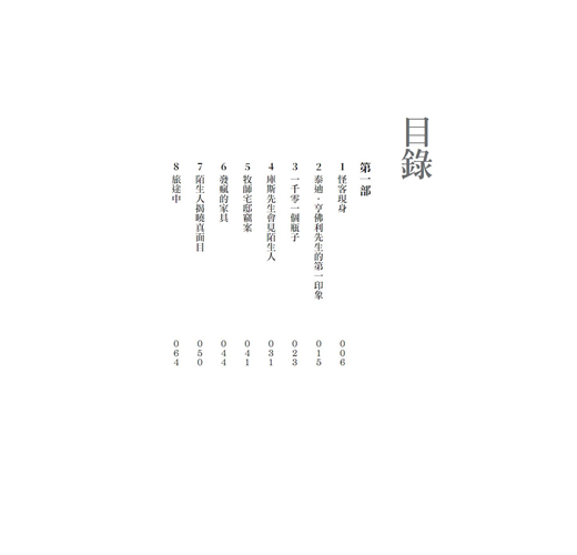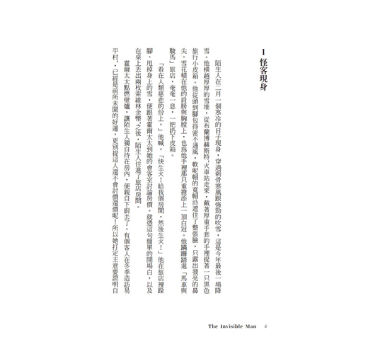 「看在人類慈悲的份上,」他喊,「快生火!給我個房間,然後生火!」他在旅店裡跺腳、甩掉身上的雪,便跟著霍爾太太到她的會客室討論房價。就憑這句簡單的開場白,以及在桌上丟出兩枚索維林金幣之後,陌生人住進了旅店房間。