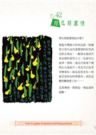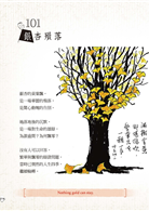 本書收錄101篇短文及畫作,內容分四輯:(一)藝文省思、(二)有情天地、(三)浮生軼事、(四)流轉生命。圖像畫風自由、隨性、多元,不講究寫實,多為寫意或象徵,有些近乎設計,更多的是素人的樸趣。文字敘述充滿溫度與深厚的文化底蘊、濃郁的人文關懷,以及生活的感悟與哲思。每篇文章皆佐以英文短句,饒富哲理,畫龍點睛;書末另附精美書卡。全書圖像、中文、英文互相呼應對話,是圖畫與文字邂逅的生命讀本,也是知性與感性兼具的生活筆記書。