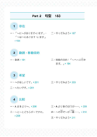 Part 1將文法分類成11個重點單元,包含「指示語」、「疑問詞」、「數量詞」、「形式」、「名詞」、「形容詞」、「動詞」、「助詞」、「接續詞」、「副詞」、「招呼用語」。