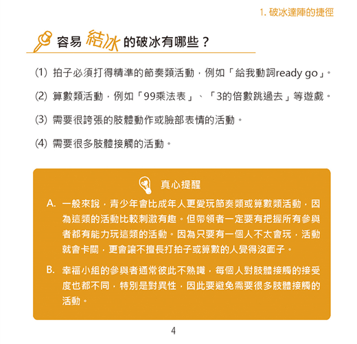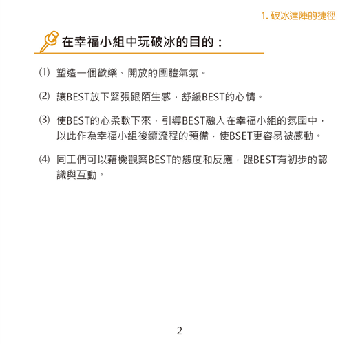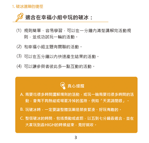 幸福小組中所進行的破冰,有其明確的目標及方向,絕非只是一個單純的流程。因此,帶領者所選 擇的破冰、帶領的方式及用字遣詞 等,都要用心及講究。