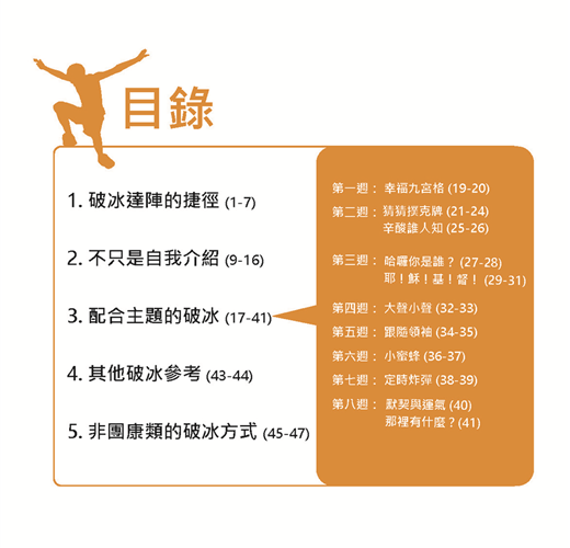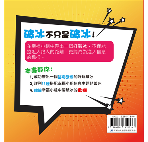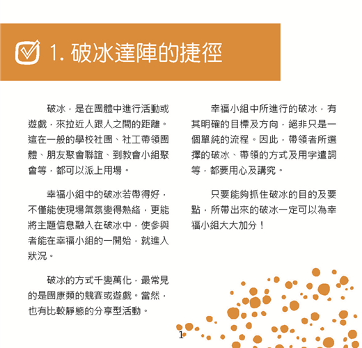 幸福小組中的破冰若帶得好,不僅能使現場氣氛變得熱絡,更能將主題信息融入在破冰中,使參與者能在幸福小組的一開始,就進入 狀況。