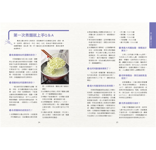 作者整理出學生、親友常問的烹調麵食成敗Q&A,只要詳讀問題與解答,很快就可以從容面對,並且能舉一反三,成為麵食高手。