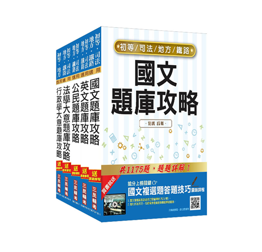 《國文題庫攻略》:本書整合國文考科試題,共1175題。第一部分〈主題式分類題庫〉依國文考科重點內容分為「字形」、「字音」、「字義」、「成語測驗」;「古文」、「詩詞曲」;「國學常識」;「常用題辭」;「新文藝」;「書信格式用語」、「公文格式用語」等十大主題。第二部分〈模擬試題〉附有5回試題。第三部分〈歷屆試題〉收錄105年至107年初等考試、鐵路佐級等國文考科歷屆試題,共10份。