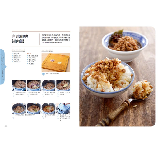 所以,安妮把自己擅長的各種料理,呈現在書中。除了道地的台灣菜,忙碌減肥的時候,可以吃吃清爽料理;朋友聚餐時,就要做出美味豐盛的佳餚;和妹妹一起吃飯,就準備可以吃飽又吃好的餐點或是家鄉菜;因為喜歡台灣的滷肉飯,旅行時,進而發現其實每個國家都有屬於自己的滷肉飯形式,於是也把這些異國的滷肉飯,呈現給大家……。