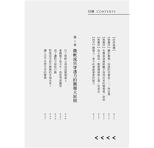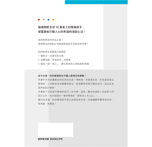 本書除了介紹高手簡報的技巧(如手勢、語氣、聲音的調節)與投影片的設計之外,也介紹展示一場好簡報的「微軟流6大心法」。