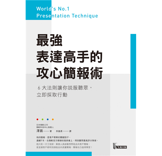 這是一本切入核心、打動人心的工具書。作者將其在日本微軟公司簡報的成功經驗編撰成書,每個建議的前因後果都說明得很清楚,並結合了很多生活化的實例,讓作法與步驟變得簡單易懂。跟著建議一步步實踐,相信必能成就傑出簡報! ──楊紹強 ,《簡報即戰力》作者