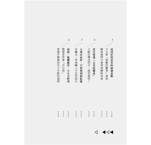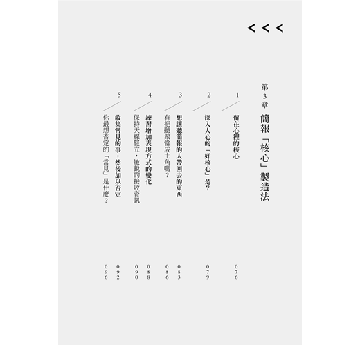 本書將以「願景與核心」這個可說是簡報出發點的本質部分和思考方式開始,到「構成、故事的建構方式」「投影片製成術」「上場時該如何說話」「疑難應答」,等所有簡報時必須考慮的要點之具體實踐方法,全都毫無遺漏地傳達給讀者。