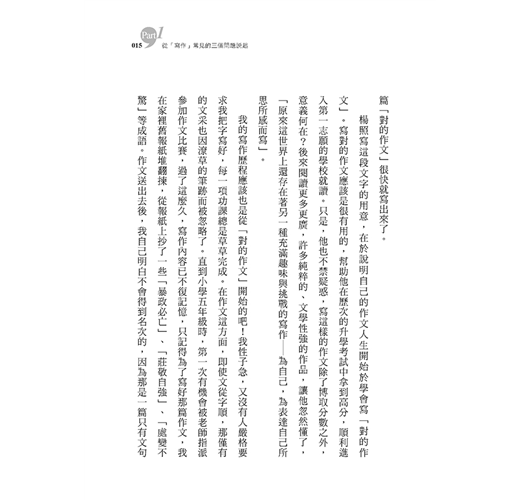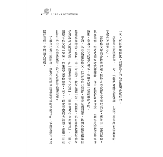 這一本書不只是寫作指南,不只是一位創作者的經驗談,更重要的是,希望把校園寫作從升學考試提升到文學的境界,寫作可以訓練,優美的寫作也可能達到。本書第一部分討論寫作是什麼、為什麼要寫作?提醒讀者(或是考生)反思寫作的意義;第二部分則循序漸進,提示寫好文章的關鍵,每一章節都有對應的文章,把寫作原理透過相關的作品賞析,達到深入淺出的學習效果;第三部分則選取時下最盛行的主題類型,形式優美、結構完整的範文,讓寫作原理能全面展示。