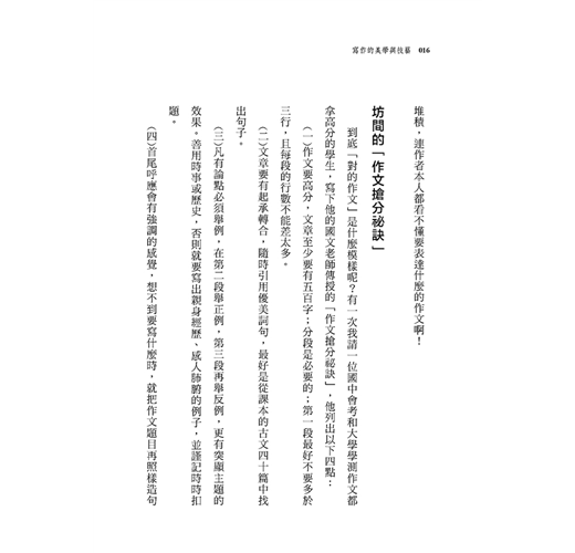到底「對的作文」是什麼模樣呢?有一次我請一位國中會考和大學學測作文都拿高分的學生,寫下他的國文老師傳授的「作文搶分祕訣」,他列出以下四點:
