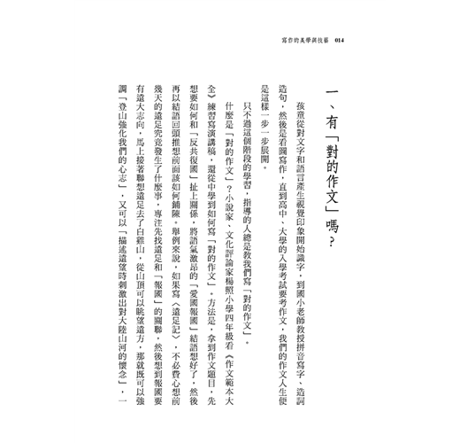 什麼是「對的作文」?小說家、文化評論家楊照小學四年級看《作文範本大全》練習寫演講稿,還從中學到如何寫「對的作文」。方法是,拿到作文題目,先想要如何和「反共復國」扯上關係,將語氣激昂的「愛國報國」結語想好了,然後再以結語回頭推想前面該如何鋪陳。舉例來說,如果...