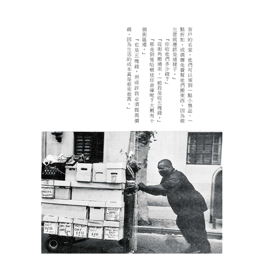 米契的研究迫使我了解一件事:對於在這些街上討生活的人,我所知的比我自己以為的還要少,儘管我已在他們身邊工作好幾年了。例如,我相當訝異地得知,這些人當中有一個次團體,彼此認識超過十五年之久,他們原本住在賓州車站裡面和周邊,後來才遷移到第六大道來。由於雜誌小販與書販之間的社會區隔,我無從得知這個迷人的資訊。假使米契沒有跟棲身在這些街區的每一個人談話,就不可能有辦法確知——更不可能記錄——他們共同的歷史,以及他們從賓州火車站遷移到第六大道的過程。對我而言,他們的遷徙故事引發了深刻的問題,因為這展現出他們有極大的適應力和能力,可以在公共空間創造出自己能生存的環境。總歸而言,或許任何類型的遷徙都是生存和適應力的故事。然而,與他們偶然相遇的人似乎從未想到這一點,包括政策制定者,他們認為用法規減少擺攤空間,或是用條例讓街販覺得較不舒適,就可以消滅這些人。