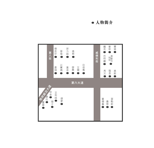 這群黑人如何先後來到第六大道並在此習得街頭維生技能?他們如何在這個棲身地滿足和解決日常需要?他們如何與來來往往的中產市民互動及建立關係?他們如何在市政府和商業促進特區高舉改造市容大旗下找尋生存的縫隙?失去這個生存據點的他們又將何去何從?杜尼爾刻劃描摹人行道上的心靈導師智者哈金、街頭最佳搭檔馬文與隆恩、使出渾身解數搭訕過路女性的墨瑞、喜歡跟小嬰兒和小狗說話的基斯、承受譴責壓力在路邊擺攤照看孫女的艾利絲等人,試圖透過筆下的這些人物來追蹤線索、解開謎團、拼湊出上述各種問題的可能答案。
