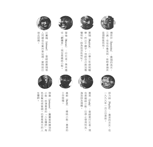 本書聚焦所在的這些街道,是大都會裡的庇護處所,在此工作和生活的男男女女的身分,隱藏在公共空間中。在路人眼裡,這些人被化約為真人版的《國家地理雜誌》駭人照片,彷彿他們就出生在街頭、完全沒有過去或其他的人生經驗。