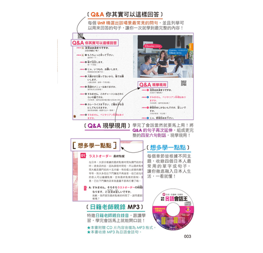 本書會話句均由日籍老師親自錄製,可立即幫助讀者學習正統發音及改善聽力。