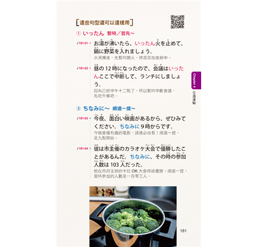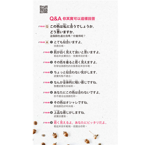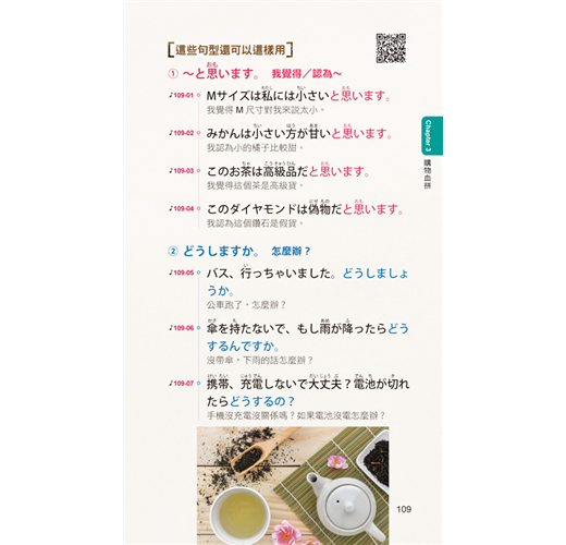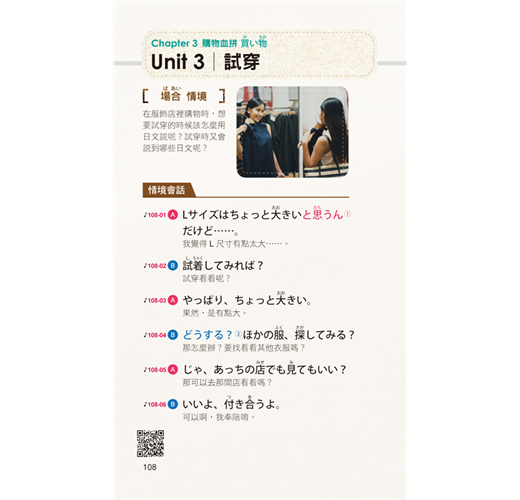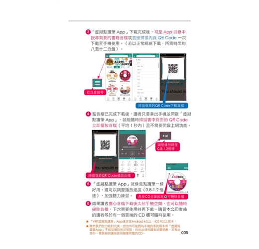 讀者只要將本書結合已安裝「虛擬點讀筆App」的手機,就能馬上利用手機隨時掃描書中的QR Code立即聽取本書的會話句。就像是使用「點讀筆」一樣方便,但卻不用再花錢另外購買「點讀筆」和「點讀書」。