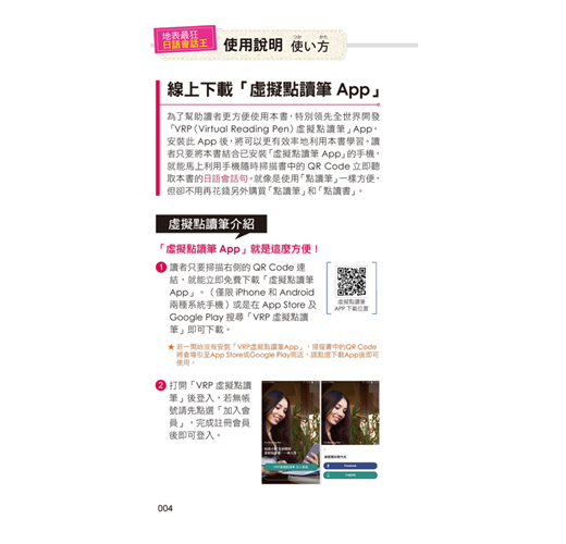 為了幫助讀者更方便使用本書,特別領先全世界開發「虛擬點讀筆App」,安裝此App後,將可以更有效率地利用本書學習。