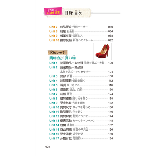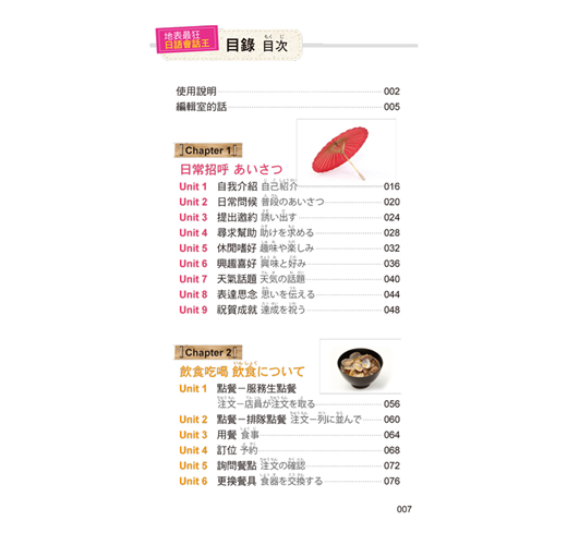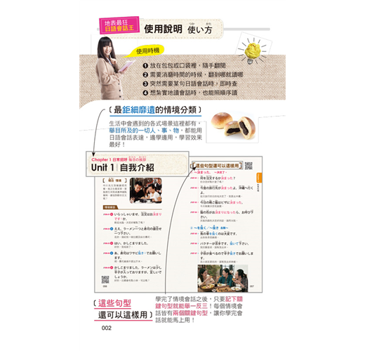 每個章節皆根據不同主題,收錄四個日本人最常用的單字或句子,讓你徹底融入日本人生活,一看就懂!
