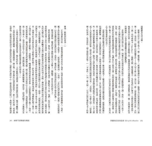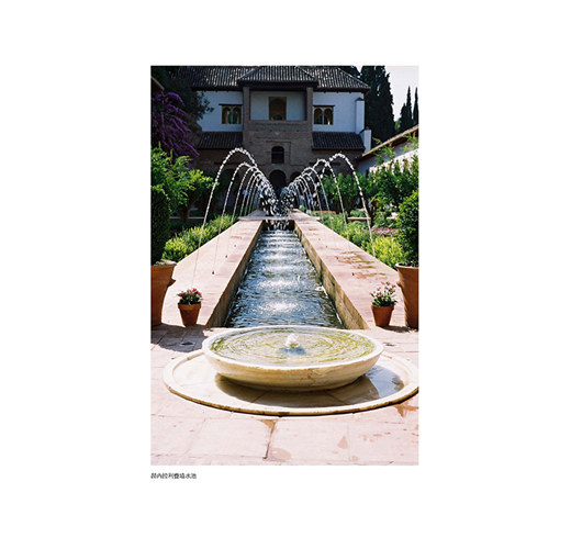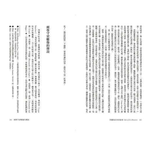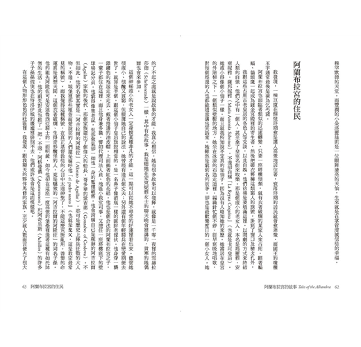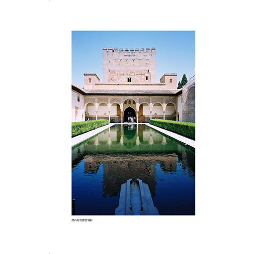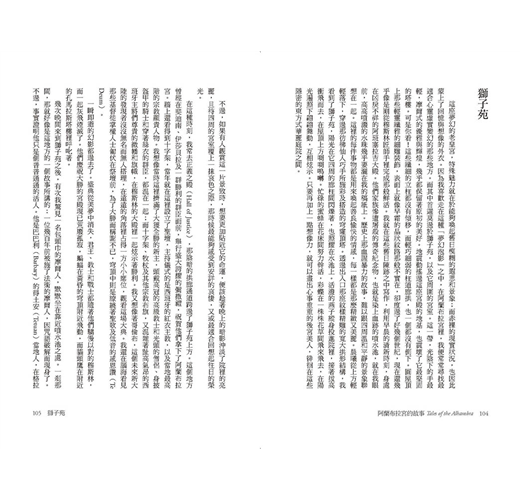 這座夢幻的老皇宮,特殊魅力就在於能夠喚起舊日模糊的遐思和景象;而赤裸的現實狀況,也因此蒙上了回憶與想像的外衣。因為我喜歡走在這種「夢幻泡影」之中,在阿蘭布拉宮裡,我便常常尋找最適合心靈虛實變幻的那些地方。而其中首選莫過於獅子苑,以及它周圍的宮室。這一帶,光陰下的手最輕,摩爾式的優雅與輝煌,幾乎都保留著原初的美好。地震動搖過這座宮殿的地基,也震壞了它最堅固的塔樓。可是你看!這些纖細的立柱都沒有傾移,而輕巧細弱的柱道廊拱,也一個都沒有倒下。圓屋頂上那些輕靈纖雅的細雕裝飾,表面上就像早霜的晶狀紋路那般不實在,卻度過了好幾個世紀,現在還幾乎像是剛從穆斯林匠師手裡完成那般鮮活。我就在這些舊日陳跡之中寫作,利用早晨的清新時刻,身處在凶戾不祥的阿班塞拉吉大殿。他們家族慘遭屠殺的傳奇紀念物,也就是染上血跡的噴水池,就在我眼前,高高噴濺的水珠幾乎要灑在我的稿紙上。歷史上那血腥暴力的故事,難以跟四周溫和平靜的景象聯想在一起。這裡的每件事物都是用來喚起善良愉快的情感,每一樣都是那麼精緻又美麗。晨曦從上方輕輕落下,穿過那彷彿仙人巧手所施彩及搭造的穹窿頂塔。透過出入口那座紋樣精雕的寬大拱形結構,我看到了獅子苑,陽光在它四周的廊柱間閃爍著,也照耀在水池上。活潑的燕子縱身投進院裡,接著拔高衝飛而去,在屋頂上方啁啁鳴囀。忙碌的蜜蜂在花床間努力幹活,彩蝶在一株株花草間飛來飛去,在陽光遍照下翩翩舞動,互相炫示。只要再加上一點想像力,就可以畫出心事重重的後宮美人,徘徊在這些隱密的東方式華麗庭院之間。