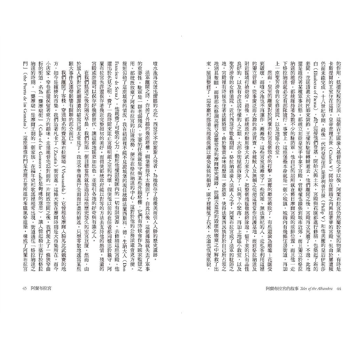 本書有某些傳說故事及隨筆文章,草成的散稿是我住在阿蘭布拉宮期間動筆寫成的,有些則是以當時的筆記、觀察為基礎,隨後增補進來的。文中小心翼翼維持著當地的色彩及寫實性,於是,整個作品或許能夠信實生動地描繪我幸而巧遇、但外在世界非常陌生不解的那個小天地,也就是那個奇特非凡的小小世界。我孜孜矻矻想要想描繪它半西班牙式、半東方式的特性,那種英雄、詩人與怪誕的交融混合。我想喚醒它牆上正在快速消逝的,那些高雅與華美的遺跡。我想記錄那些曾經進出這宮廷的,有關皇室與騎士的傳說,以及如今穴居宮殿...