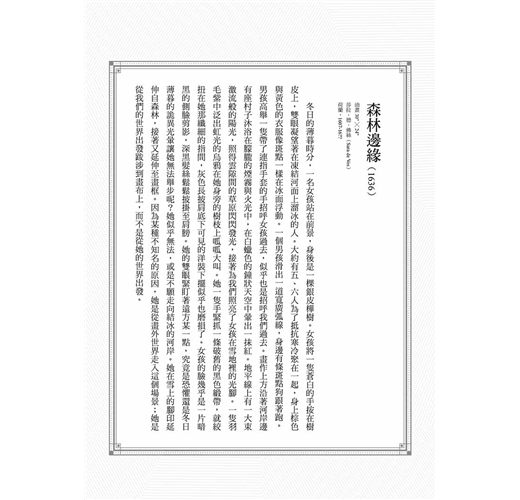 ✹《紐約時報》書評編輯精選1631年,畫家繁盛的荷蘭黃金年代,莎拉(Sara de Vos)是第一位入會荷蘭聖路加公會的女畫家。民風保守的時代,多數女性畫家只能創作靜物畫,不能從事風景畫,而後人對莎拉的紀錄鮮少,唯一僅存的風景畫〈森林邊緣〉描繪出女孩站在冬日薄暮之下,盯著遠方一處,透過這幅畫,莎拉的內心世界成了世人眼中的謎團。