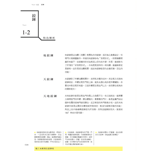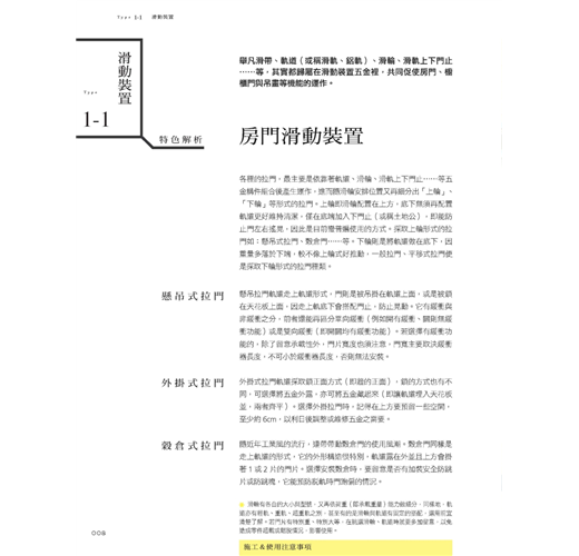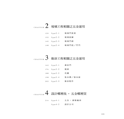 分門別類,從居家裝潢必做的木作、玻璃、衛浴3大工程切入,囊括:滑動裝置、鉸鍊、門弓器、把手/取手、鎖類、門擋/門止、門閂/地栓/天地栓、滑軌/軌道、撐桿、櫃內配件、抽屜配件、層板/吊掛配件、玻璃門裝置、玻璃鉸鍊、玻璃門鎖/地鎖、玻璃門把/門閂、淋浴門、龍頭、花灑、集水槽/落水頭、衛浴配件等21項五金類別,告訴你選擇上該注意的重點,以及使用五金時要注意的事,輕鬆理解五金各項事,讓你的生活更舒適。