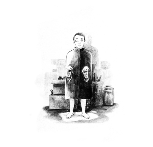 那個人舉起發著抖的指尖,指著千姑姑手上拿的布。千姑姑疑惑地偏著頭,攤開手上用來擦拭積水,變得溼答答的布。是一條褲子。千姑姑趕緊將褲子遞給那個人,只見他剛接過褲子,難為情地吸了一下鼻涕,接著就打了個大噴嚏。