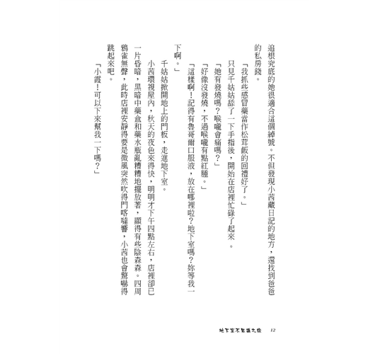 《地下室不思議之旅》是一部讀完之後讓人回味再三的奇妙故事。故事的節奏很有趣,讀者從尋常小鎮的藥局,一下子掉進某個奇異的平行時空,時間與感覺的開關也由慢速瞬間調快,等我們跟著故事的主角小茜和千姑姑一路經歷形形色色的冒險,認識與她們其實比鄰而居的神祕國度,還有當中的各種角色與世界後再回到久違的家,一定會忍不住懷念那個世界帶來的曼妙感受哩!