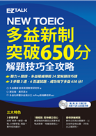 能律英語教育研究所推出《NEW TOEIC多益新制突破650分:解題技巧全攻略》,書中針對多益的聽力和閱讀提供解題技巧教學和試題練習,一共有 24 堂解題技巧課,考生可以使用書上的「解題攻略教學→橋樑題練習→實戰模擬試題」3步驟學習法,3週內就可以幫助考生突破650分。本書對於對多益新制考試還不熟悉的入門者來說,教導各題型的重點和會用到的英文文法,並提供適合每天學習的份量及難易度。